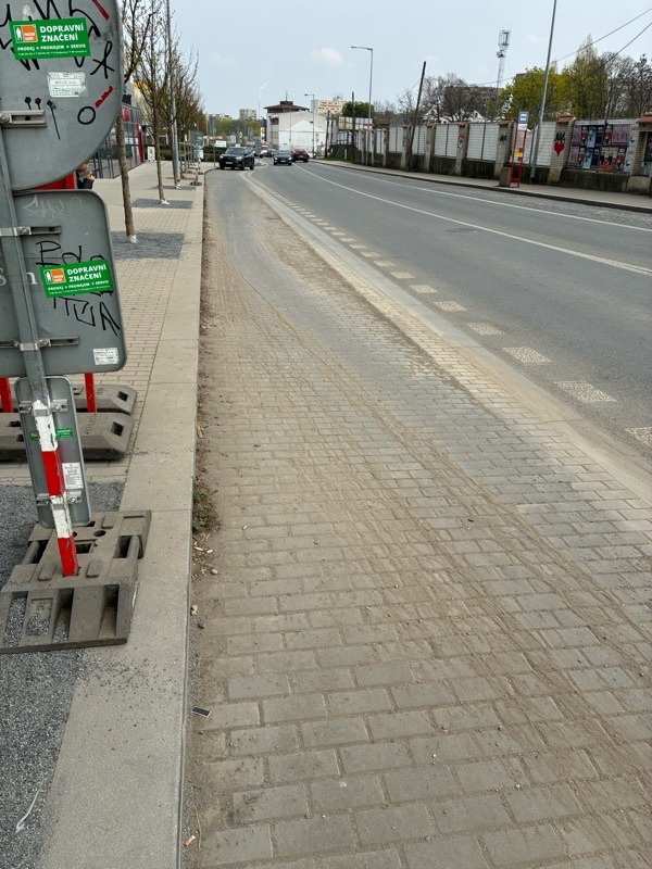 Znečištění ulice od stavby, již jednou bylo hlášeno. Při každém příjezdu autobusu jsou všichni čekající zahalení prachem. Vzhledem k množství staveb v okolí by bylo vhodné buď zajistit častější úklid nebo tlačit na investory staveb k pravidelnému úklidu