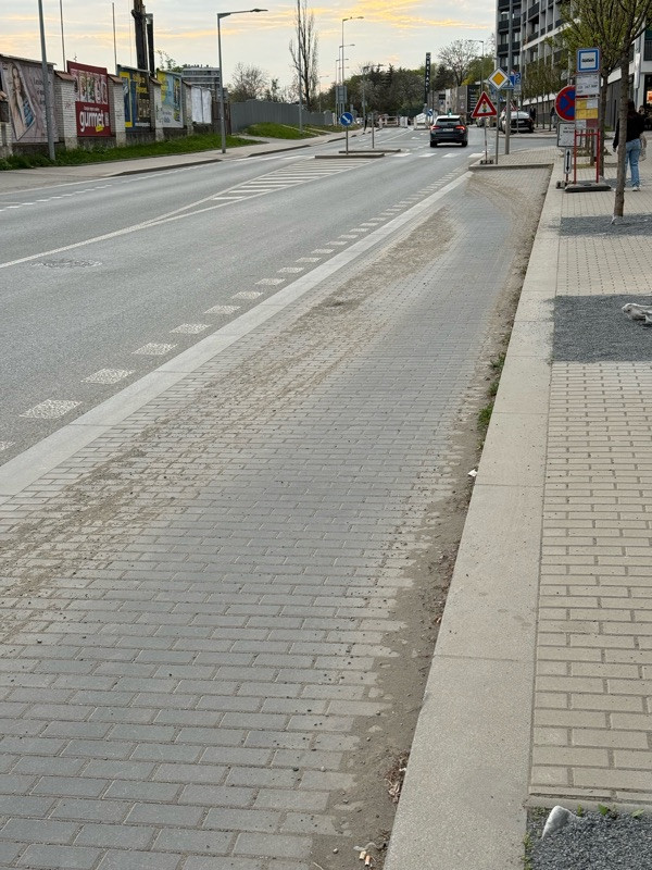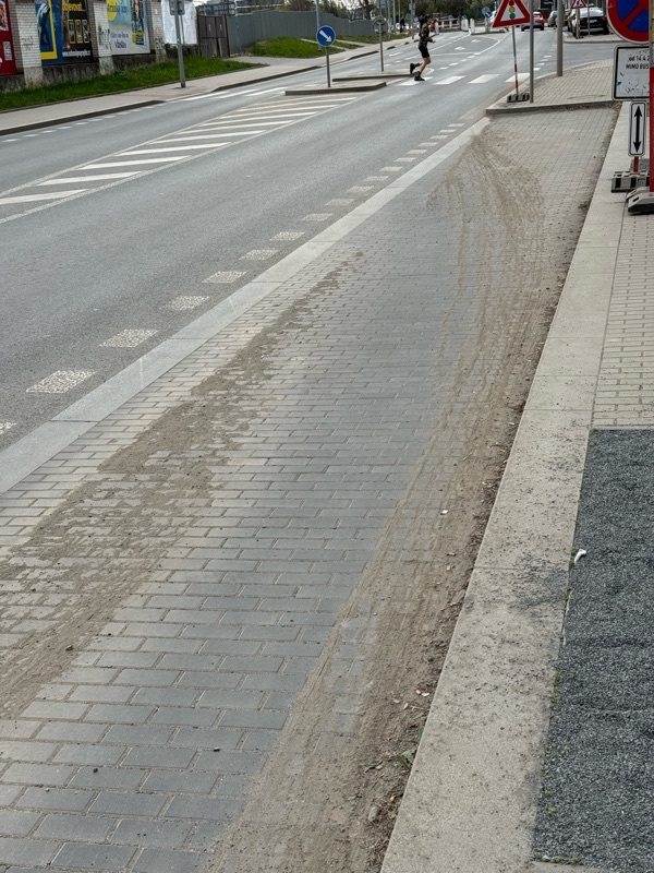 Štěrk a špína na parkovacích místech / dočasné autobusové zastávce. Podle mě je ideální čas na úklid, dokud tu nestojí auta.