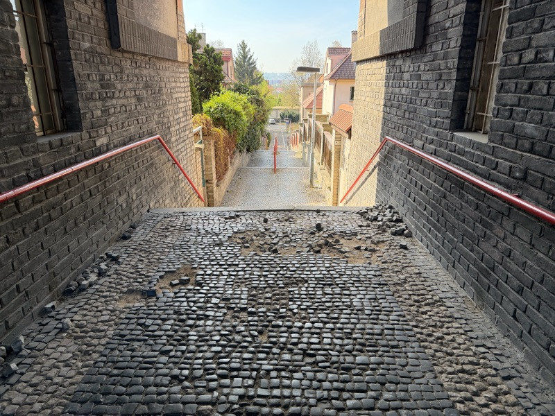 Vytrhane kostky z chodniku. Prosime o opravu. Pruchod mezi domy ulice Voticka.