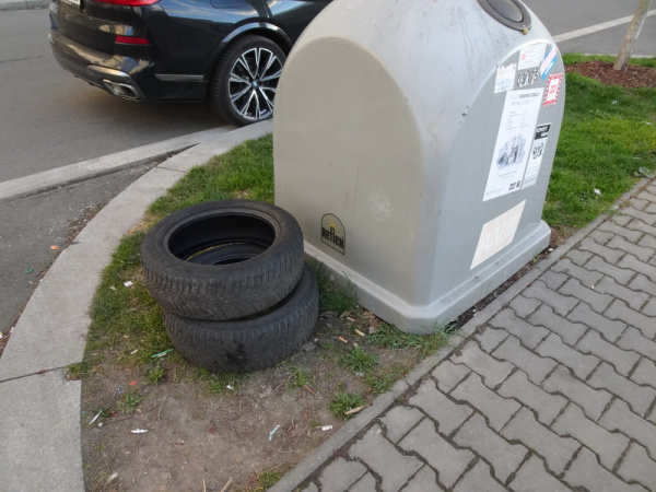 u popelnice na plechovky v ulici Zverinova jsou vyhozeny pneumatiky.