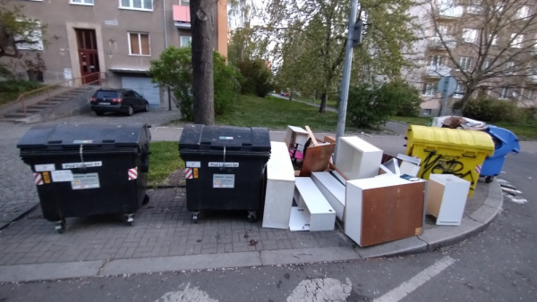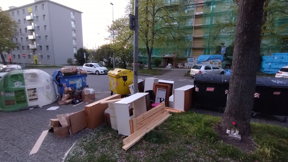 Omlouvám se, bohužel u kontejnerů pro tříděný, ale i komunální odpad se někteří naši spoluobčané rozhodli, že je zde sběrný dvůr a jakmile někdo něco odloží takto velkého mimo popelnici, tak z toho ostatní podobně naladění vyhodnotí, že je to normální. Mohl bych Vás poprosit o pomoc?