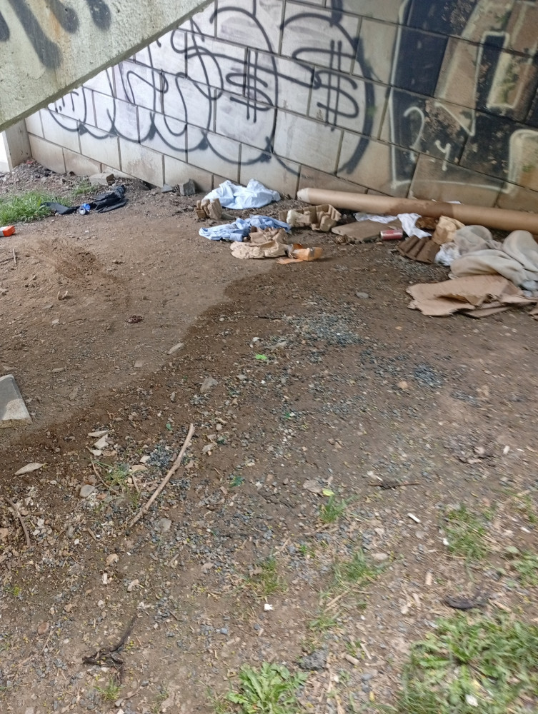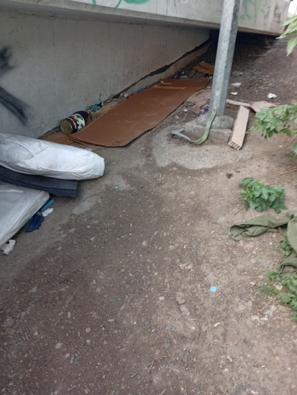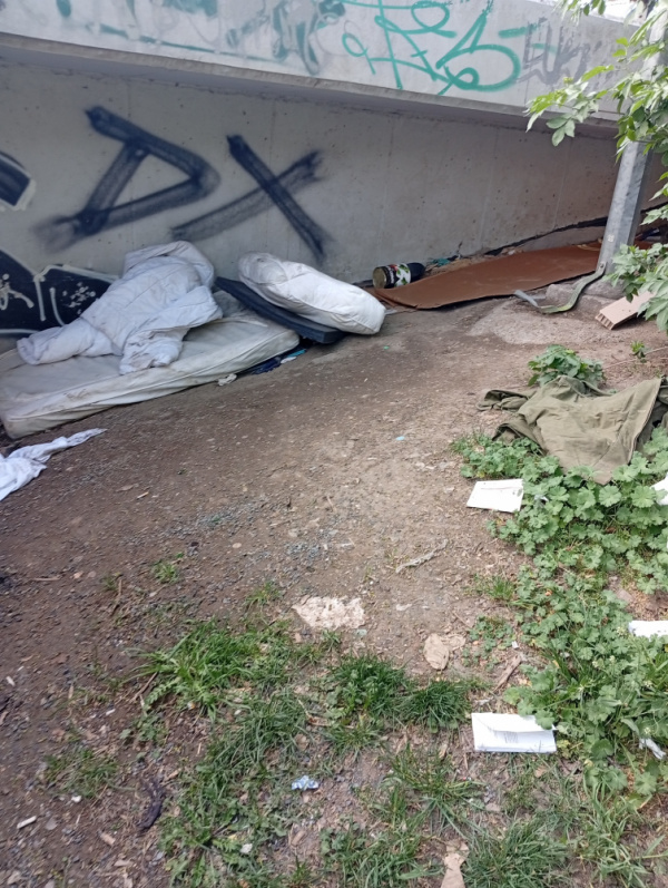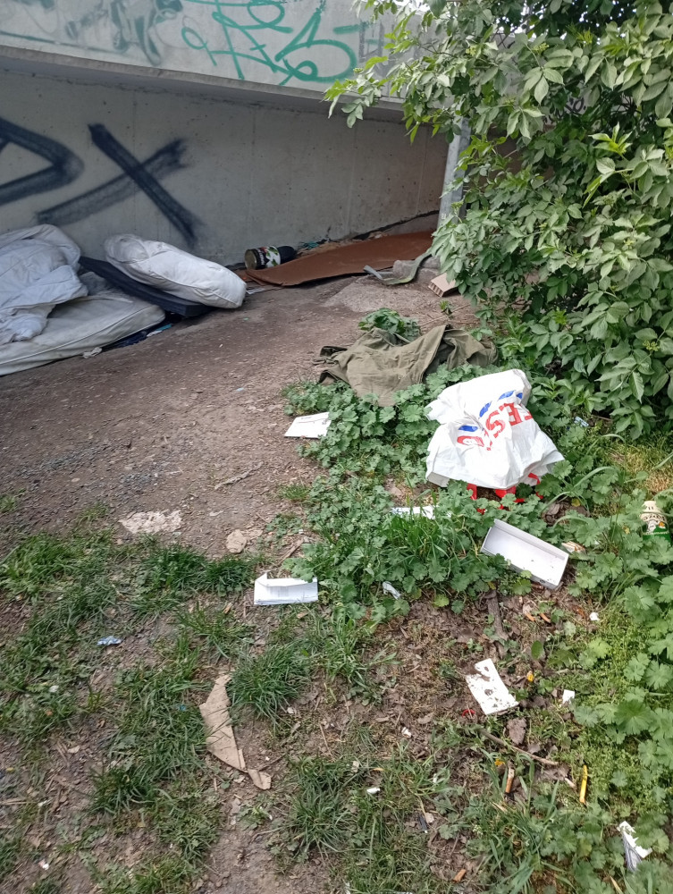 nepořádek po lidech bez přístřeší v ulici Příběnická u schodů i pod nimi.