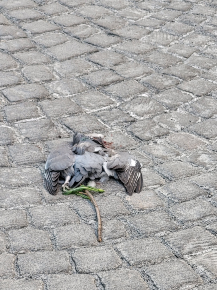 Uprostřed silnice leží mrtvý holub. Před vchodem Baranova 24.