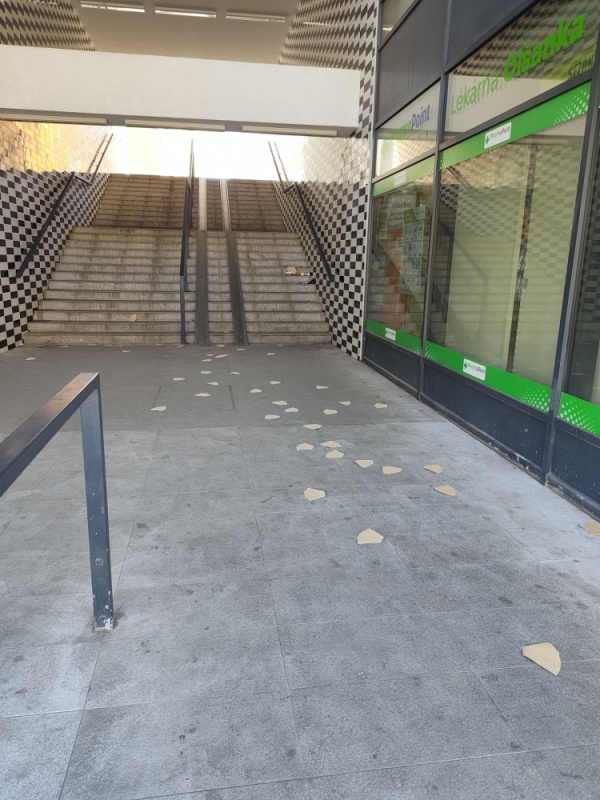 Rozházené kávové filtry v podchodu