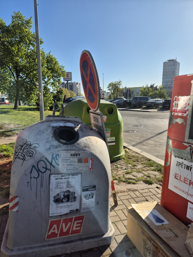Někdo vytrhl značku upozorňující na čištění ulice z podstavce a hodil ji ke kontejnerům