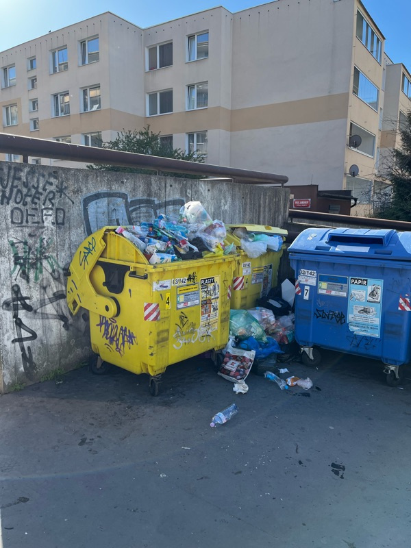 děkujeme za Váš podnět. Úklid jednotlivých stanovišť kontejnerů na tříděný odpad probíhá pravidelně podle stanoveného harmonogramu (od 6:00 do do 22:00 každý den včetně sobot a nedělí). Provedeme kontrolu a případně předáme podnět společnosti AVE CZ, která kontejnery na tříděný odpad vyváží a za pořádek kolem nich odpovídá.