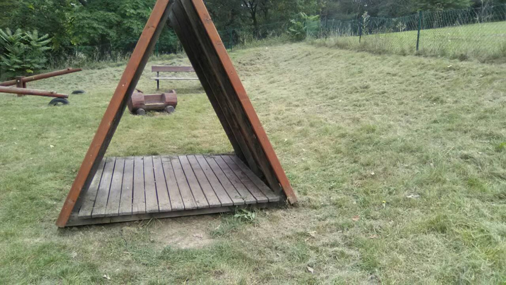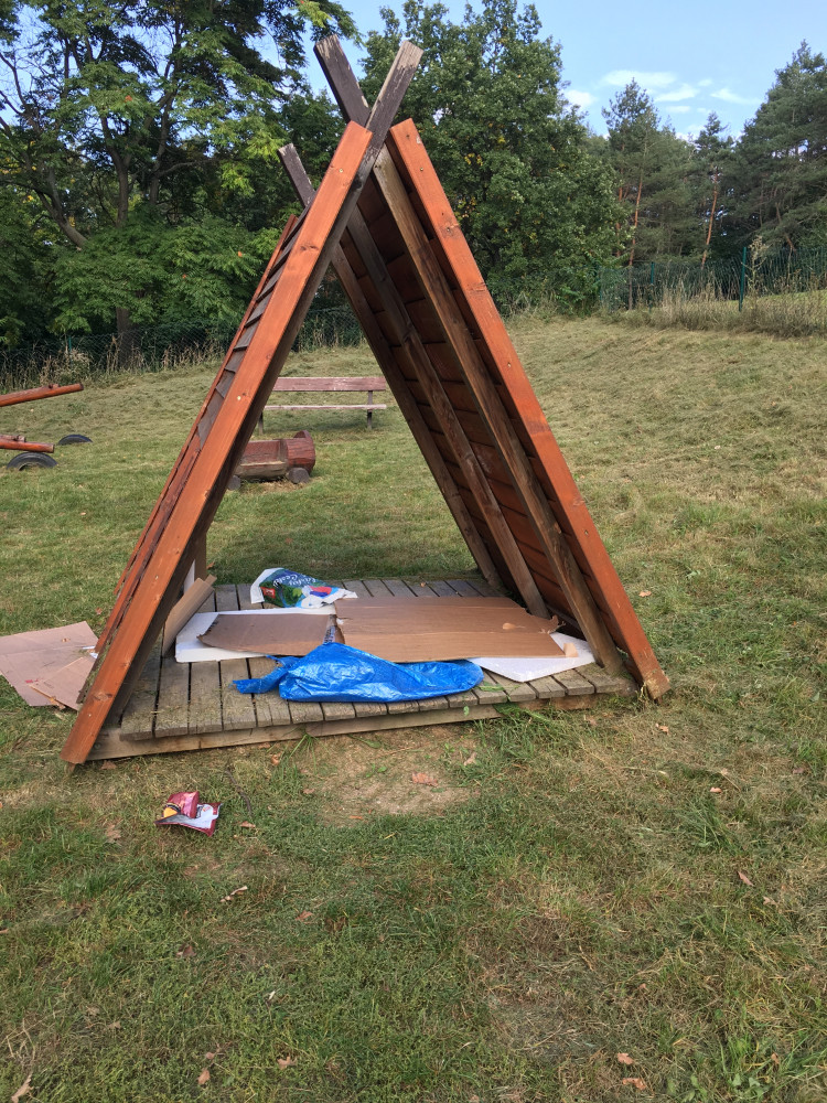 Odpadky na dětském hřišti Na krejcarku ( nejspíš spaní pro bezdomovce)