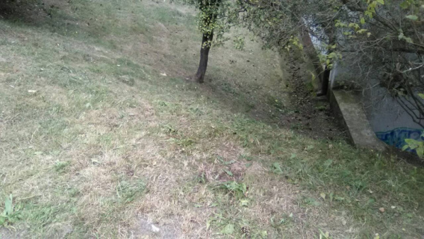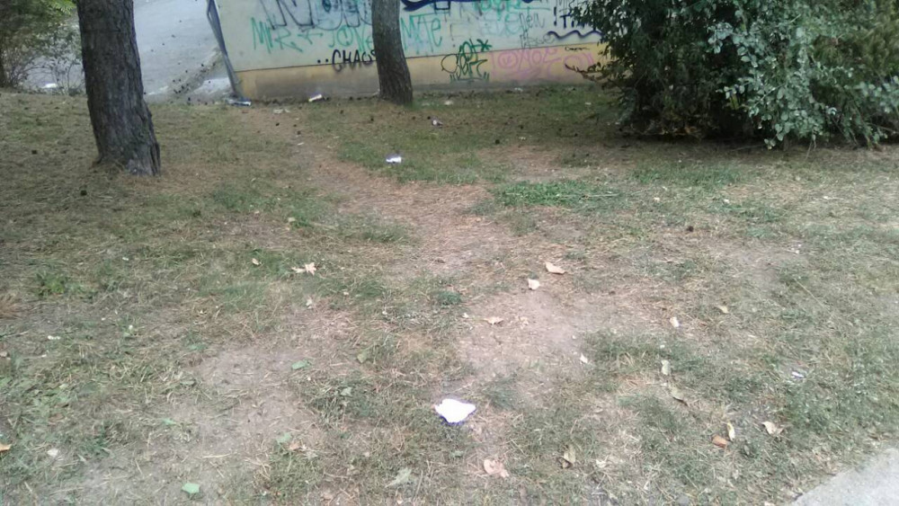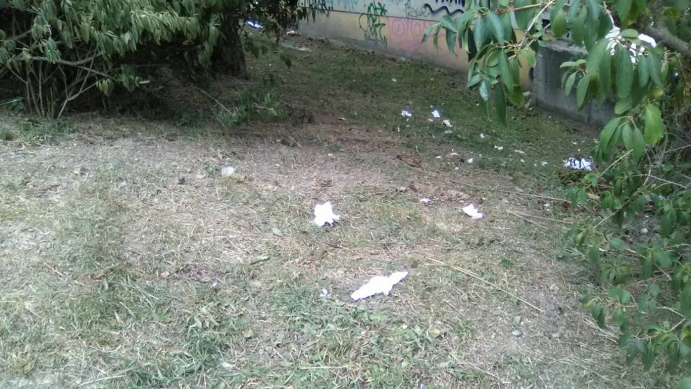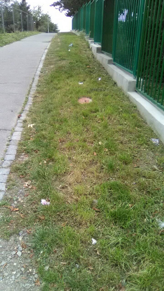 Rozhazene odpadky ve svahu mezi schody od Rixdorfske a garazemi a dal podel plotu u skolky