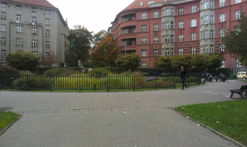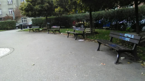 Škroupové nám.: odpadky kolem laviček.