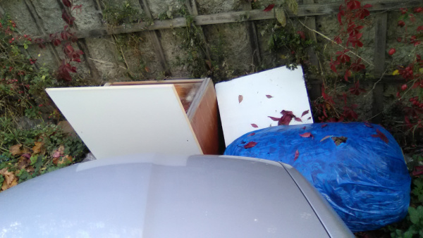 Nábytek a odpad v zeleni.