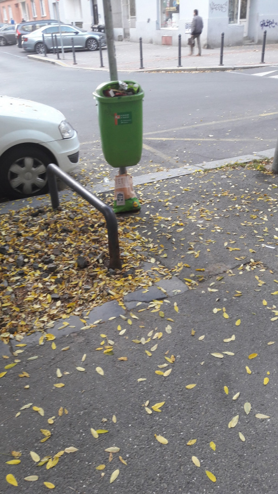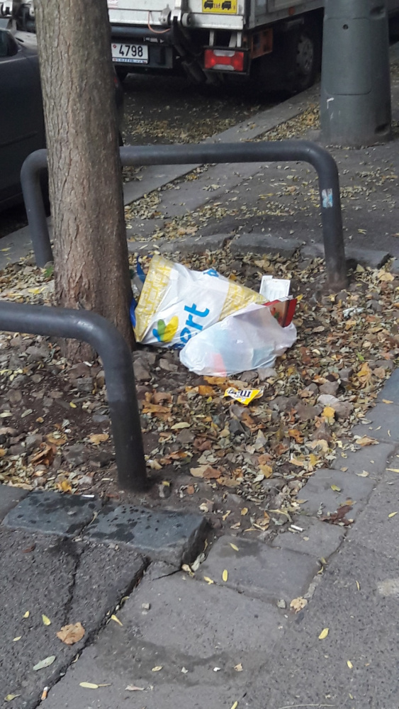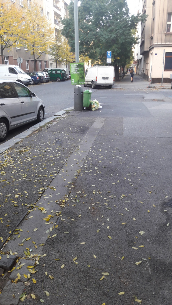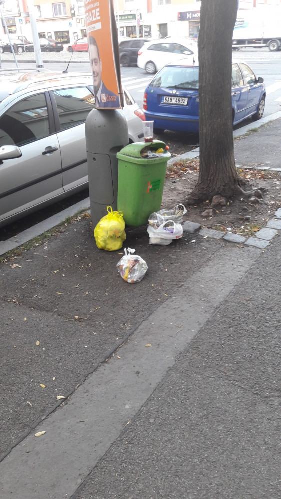 V Biskupcově ulici mezi Viklefovou a Jana Želivského jsou prakticky u každého koše pro psy poházené igelitky s odpadky: