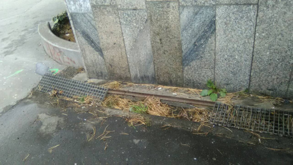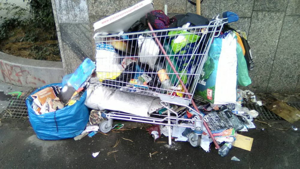 Nepořádek a nákupní košík u vstupu do metra.