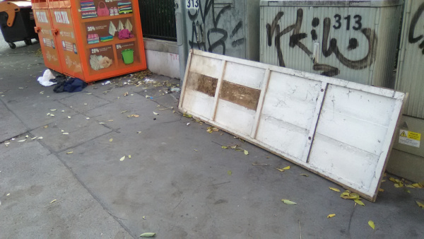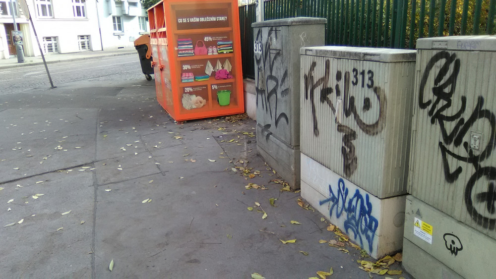 Nepořádek u kontejneru na textil.