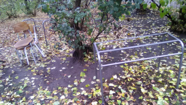 Židle a stoly naházené ve křoví. Hlásil pan Sivák