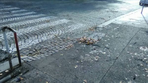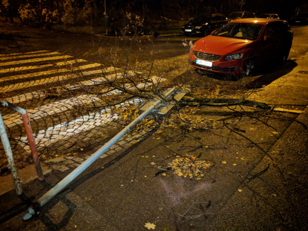 Ulomená větev na chodníku a stržená dopravní značka na přechodu pro chodce