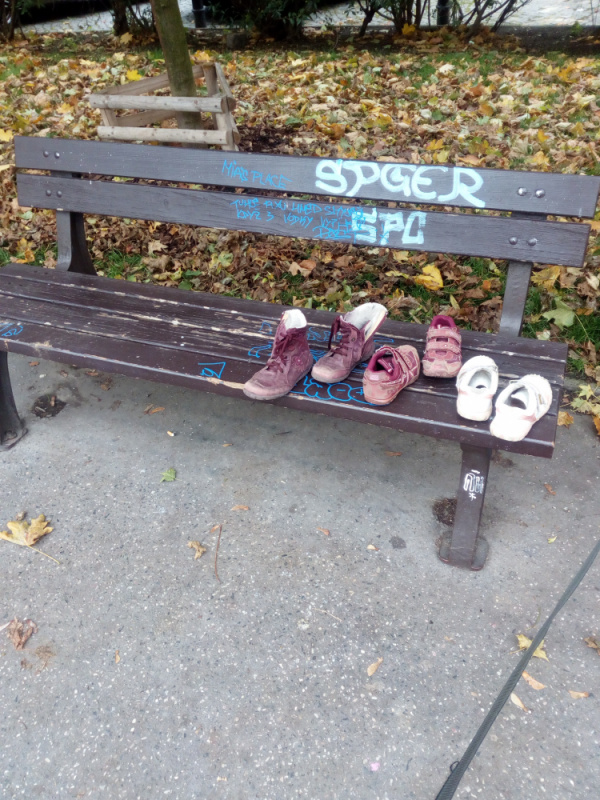 Už dva dny jsou na lavičce na Škroupovo nám. Dětské botičky. Prosím o úklid.