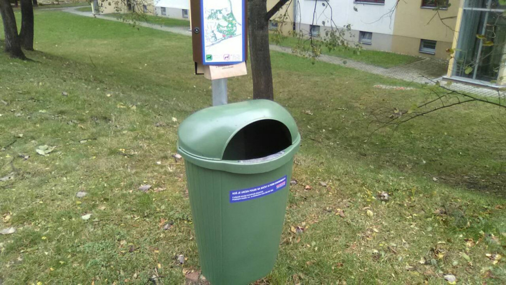 Plná nádoba na psí exkrementy a chybějící sáčky u laviček za barákem K Chmelnici 2492