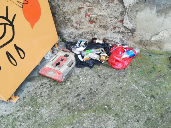 Kupa odpadků u textilního kontejneru.