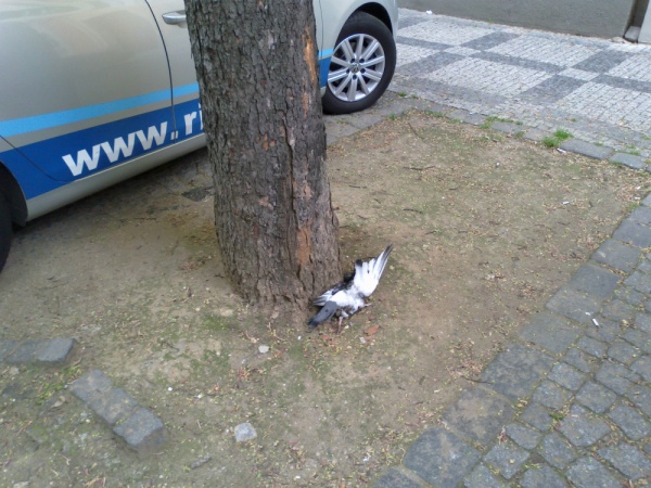 Mrtvý pták, odpadky na ulici.