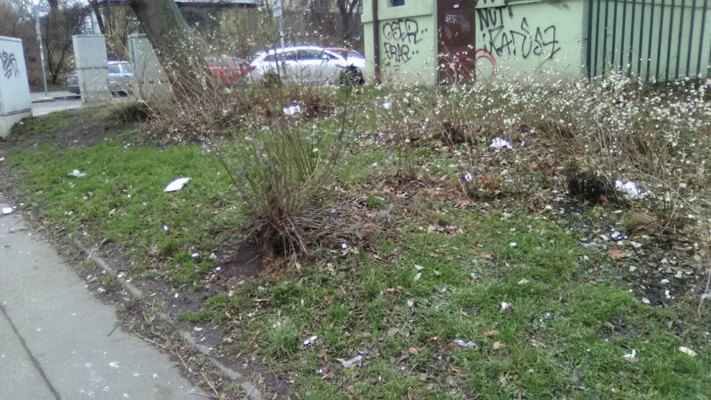 Nafoukané odpadky v zeleni.