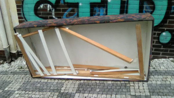Pohozená postel a nějaké cihly.