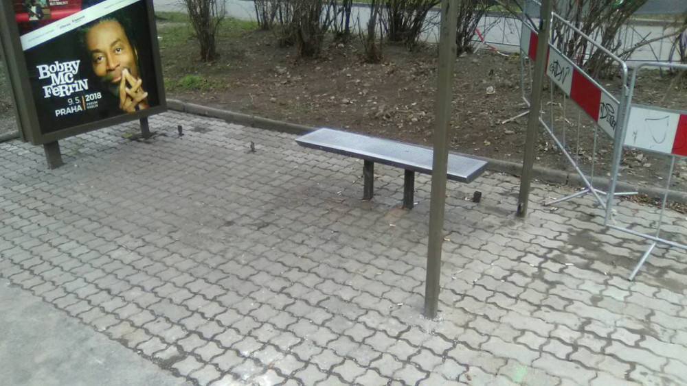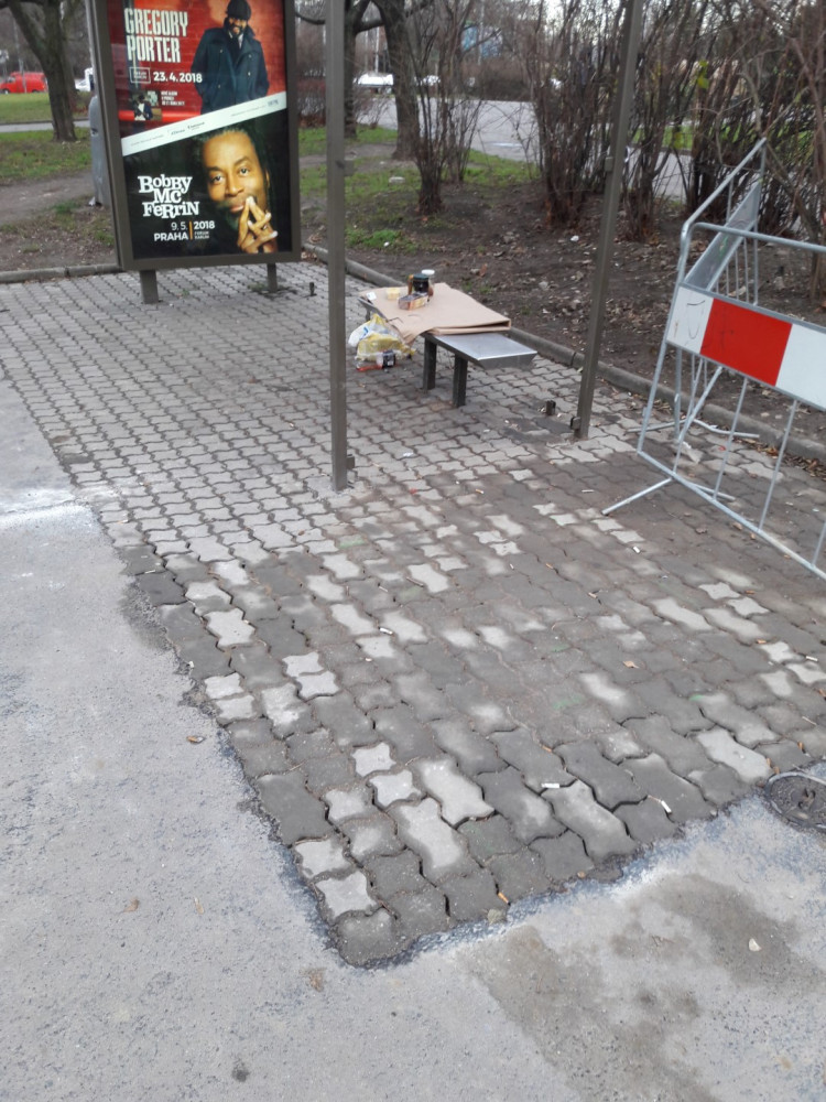 U přístřešku tramvajové zastávky Ohrada směrem do centra jsou zbytky po bezdomovcích.