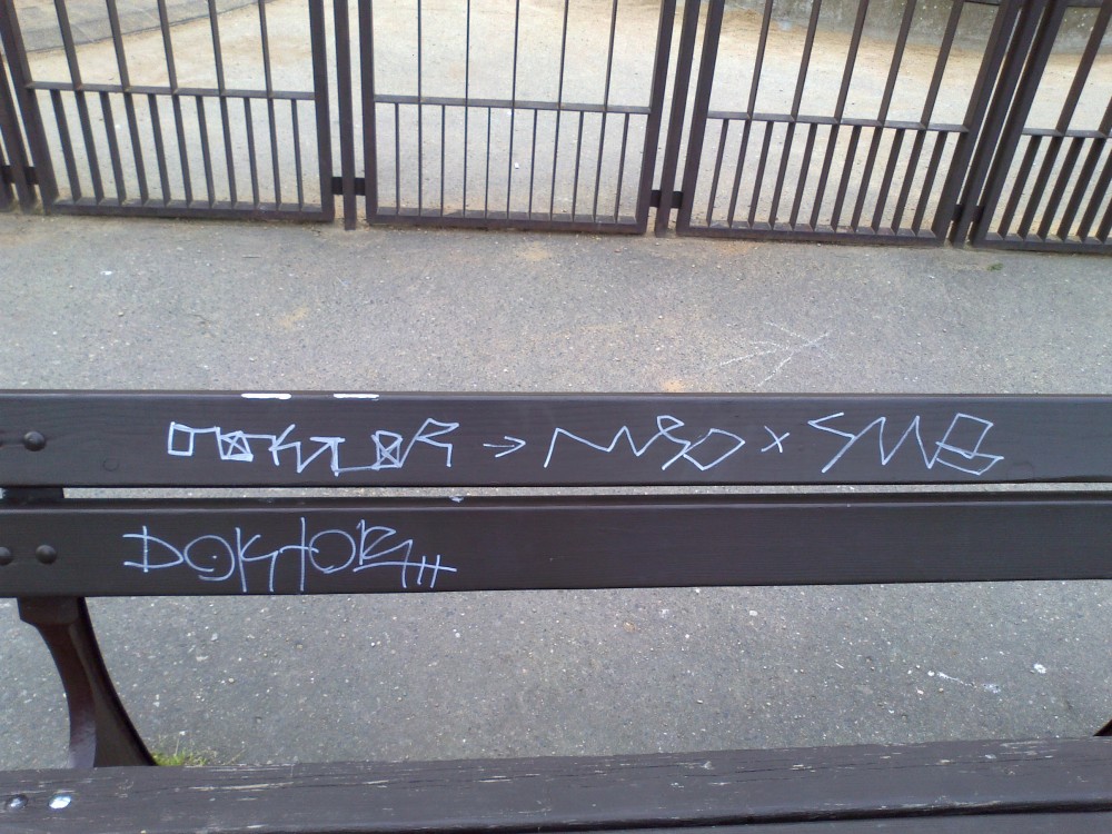 Posprejované lavičky u dětského hřiště. Mám ráda čistou Prahu 3.