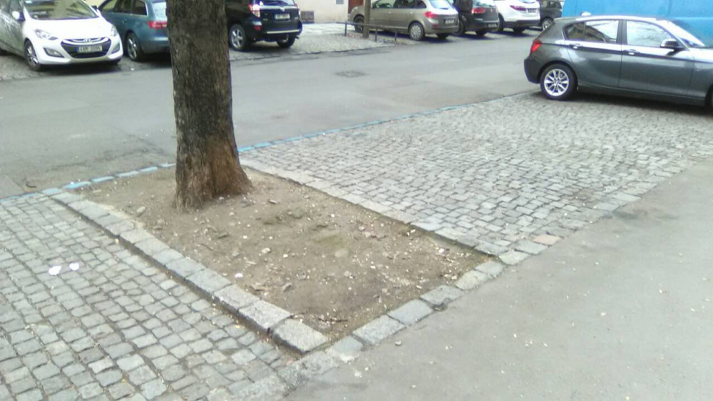 Psí exkrementy na ulici. Mimochodem, v tom segmentu ulice se nějaké exkrementy nacházejí téměř na každého ostrůvku země kolem stromů.