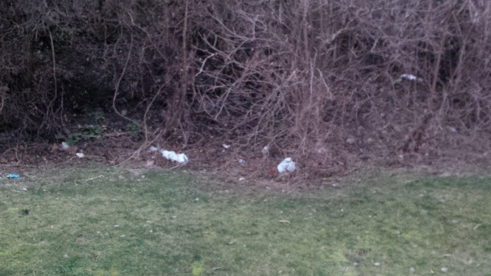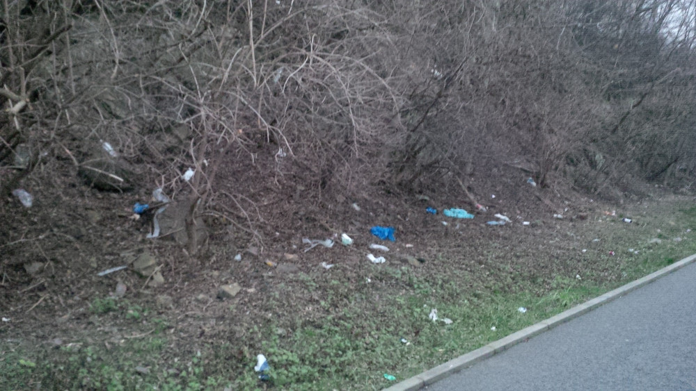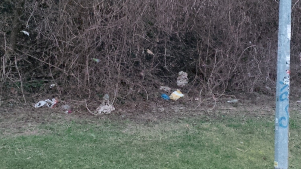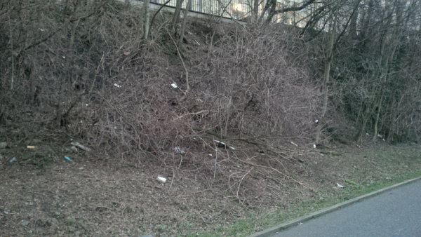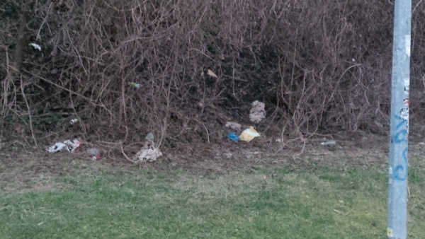 Odpadky v zeleni podél vítkovské cyklotrasy, úsek souběžný s ulicí Příběnická, v délce cca 100 m