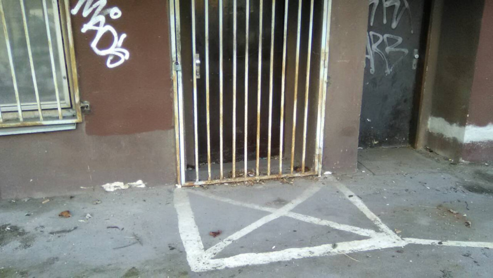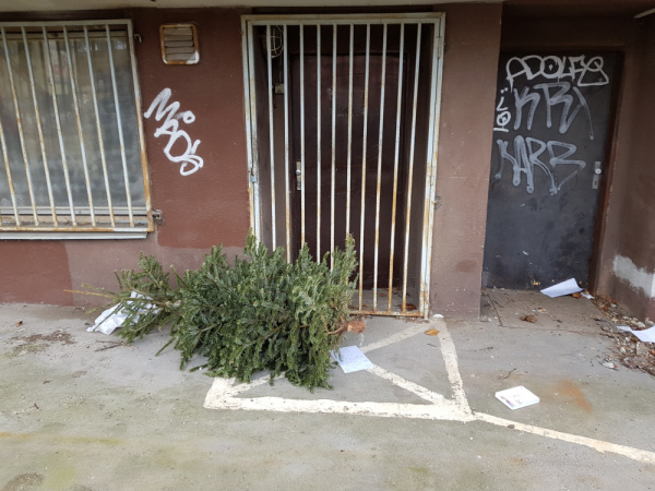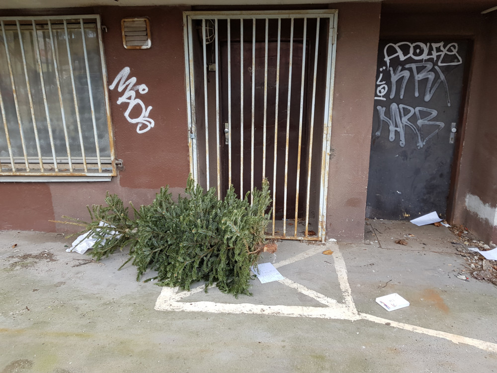 Velký nepořádek pod schodištěm v Roháčově 48,46 (stromeček,pneu a odpadky)
