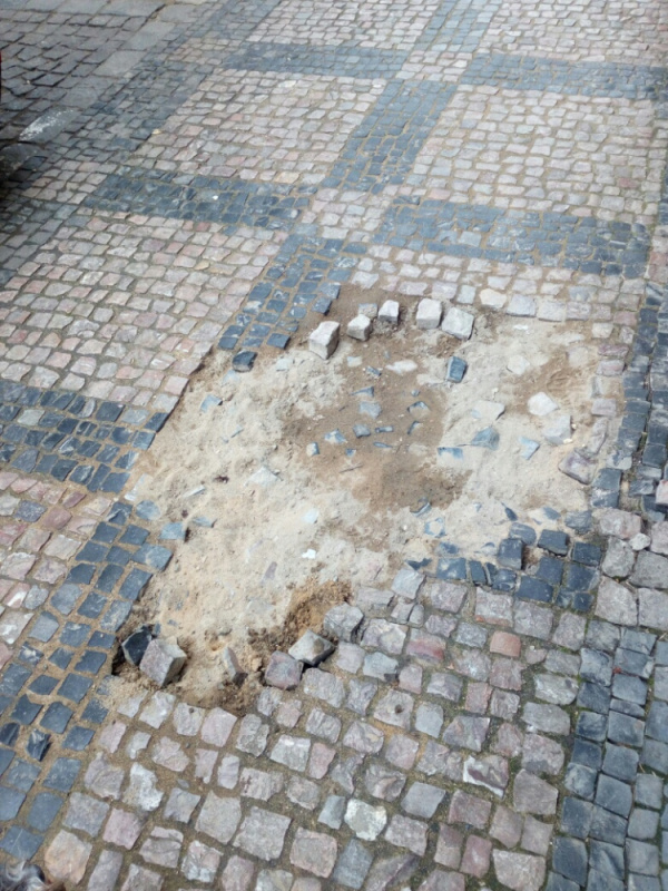 Pospisilova ul. u hospody U Sadu rozbitý chodník ( dlažební kostky na chodníku)