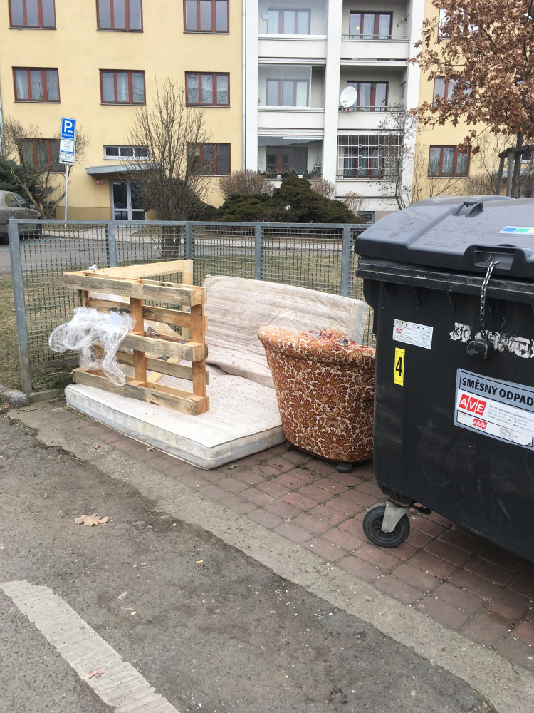 U popelnice je křeslo a kus nábytku.