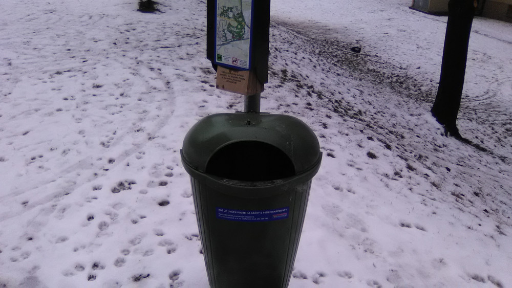 Prosím o vyprázdnění koše na psi exkrementy. Děkuji K Chmelnici 3, zadní objekt u laviček