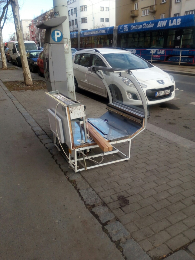 u parkovacích hodin v Konevove ulici u baráku c. 167 postavený starý chladicí pult. Prosím o odvoz.