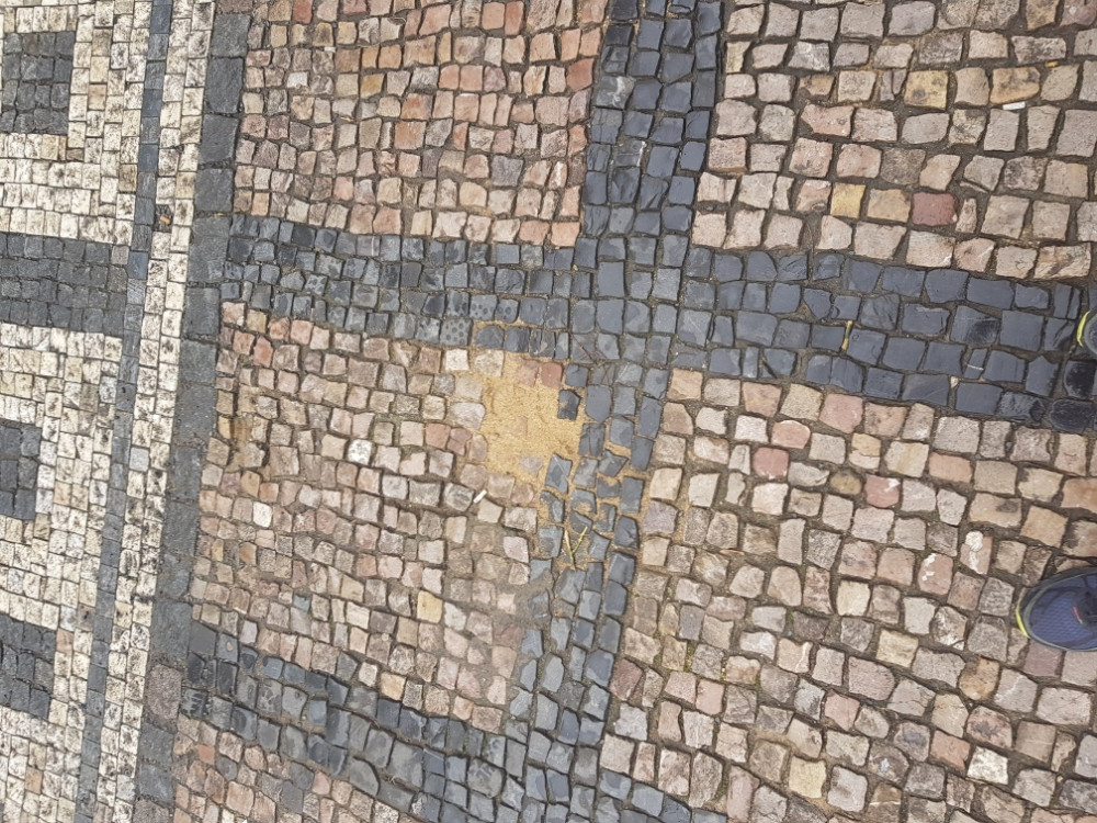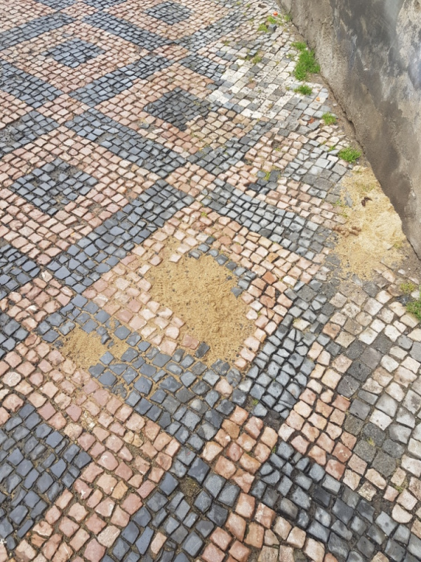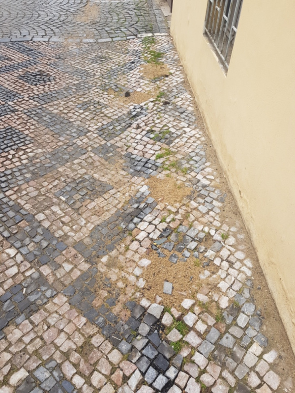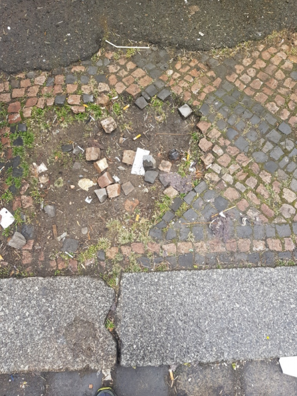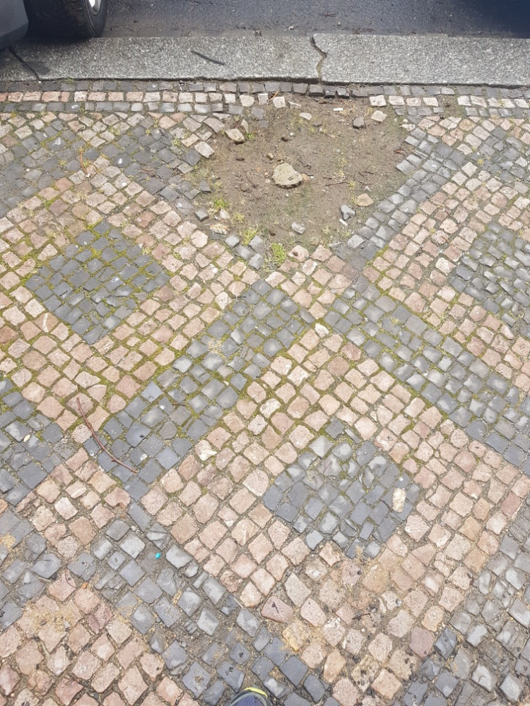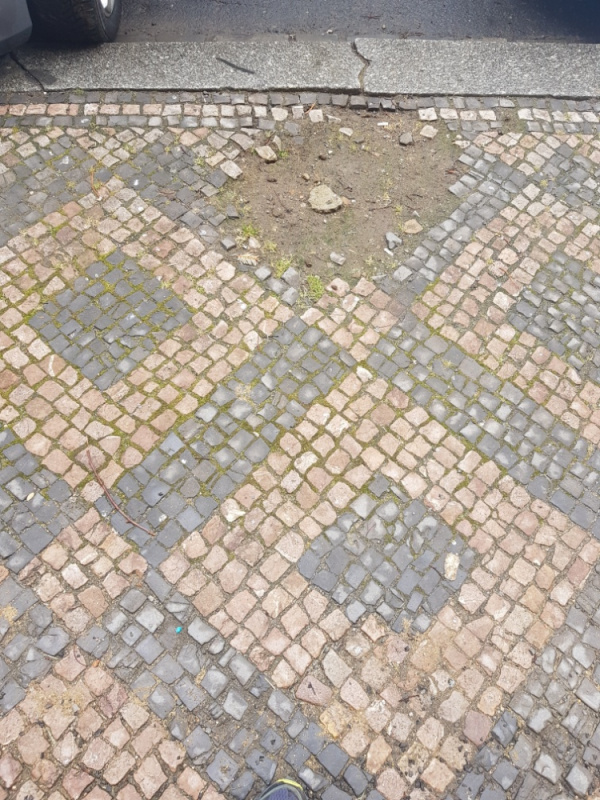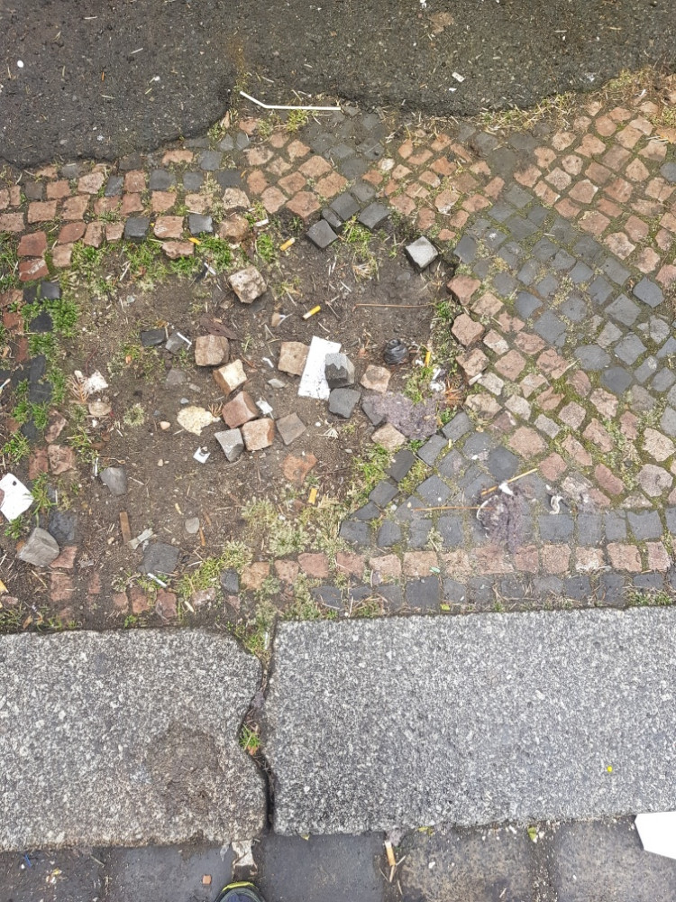 Rozbitý chodník v ulici Velehradská mezi ulicemi Vinohradská a Přemyslovská.