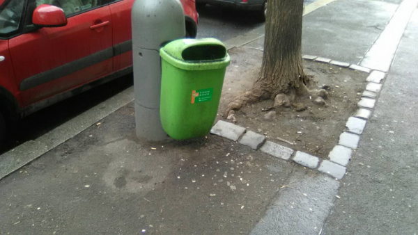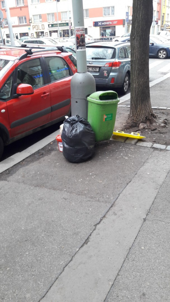 Nepořádek kolem koše. Kousek dál, směrem ke garážím před vietnamskou prodejnou, je koberec a černý pytel s odpadky. Děkuji.