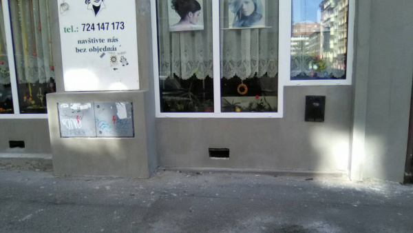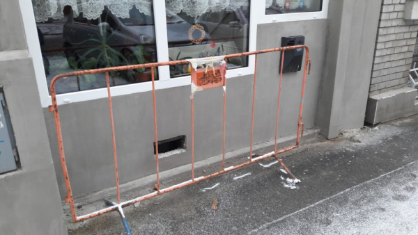 Zábrana u kadeřnictví. Stojí tam už několik měsíců po ukončení stavby, nikdo se k ní nehlásí.