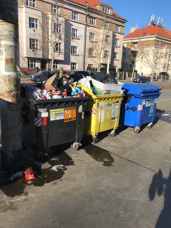 Opět plné popelnice. Prosím o zvýšení frekvence odvozu odpadu. Jsou zde vysokoškolské koleje.