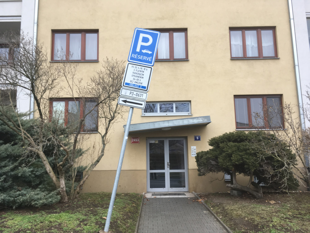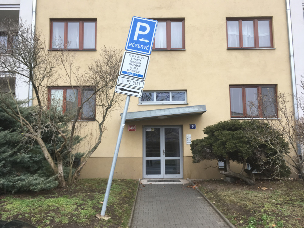 Uvolněná dopravni značka na parkování před domem K chmelnici 5.