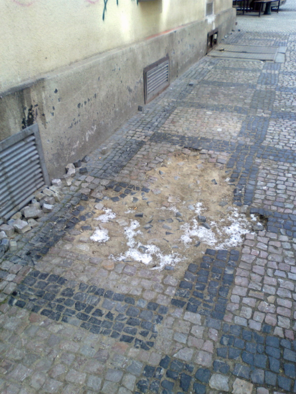 Chodník, poškozená dlažba o velikosti cca 1 x 1 m, Pospíšilova 2. Již dlouho.