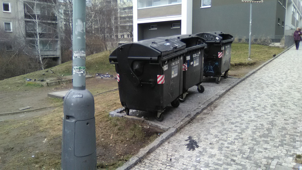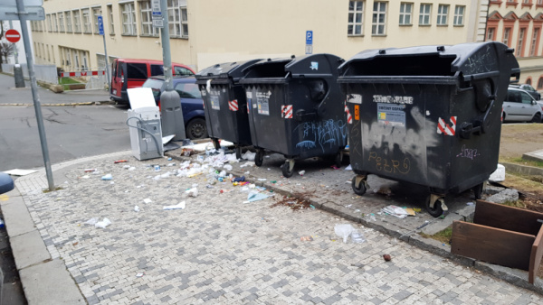 Odpadky na ulici kolem kontejneru. Vyhozena stara pracka.