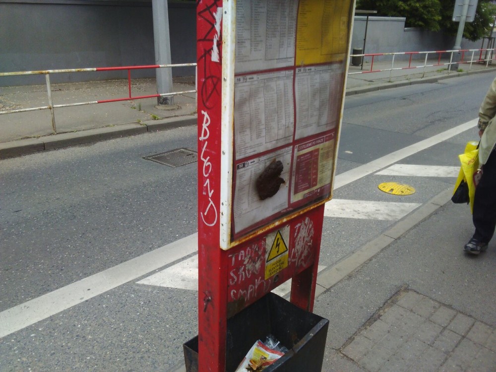 děkujeme za Váš podnět. Exkrement, který někdo připlácl na stojan s jízdními řády jsme odstranili a místo vyčistili a vydezinfikovali.