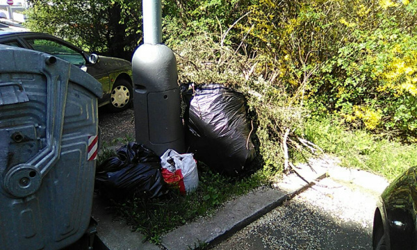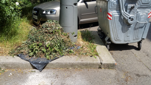 V Praze 3 , Kunesova 10, U kontejneru je slozena cerna skladka rostlinneho odpadu slozena v cernych pytlich a navrch jsou.vetve.