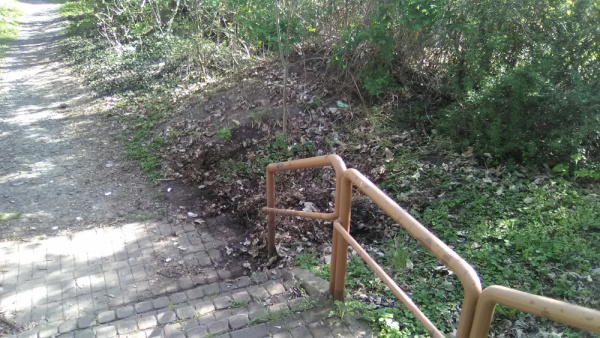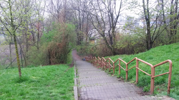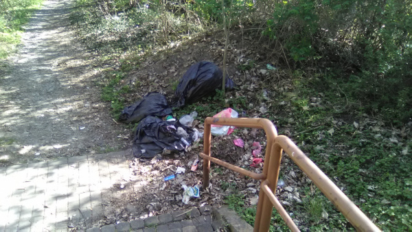 Pod schody jsou uložené pytle s odpadem. Jedná se o schody v půlce parku – rovnoběžné s ulicí Za Žižkovskou vozovnou.