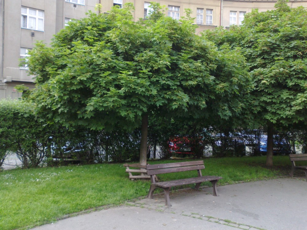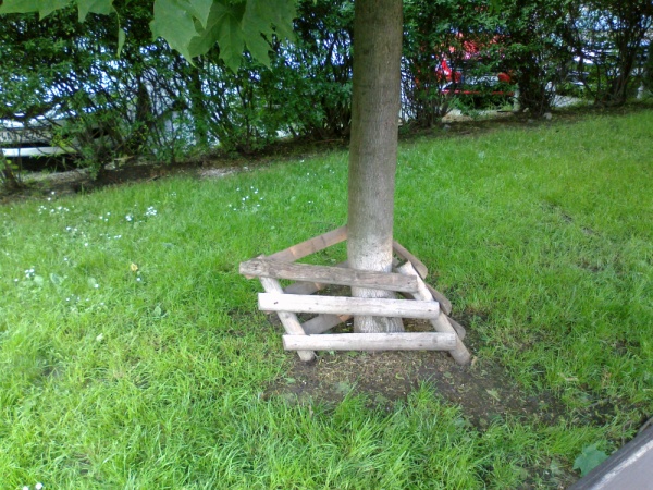 Poškozené/nefunkční hrazení již vzrostlého stromu. Nefunkční platí pro celé Škroupovo nám.