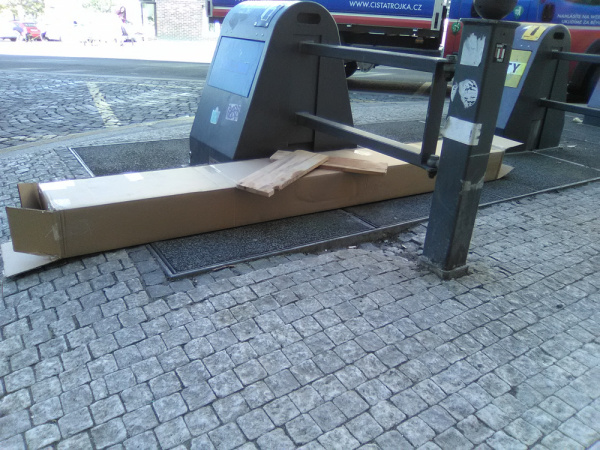 Drevo a karton kolem nádob.
