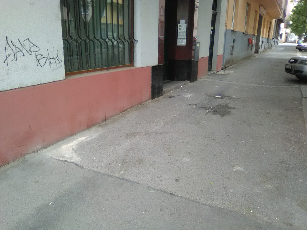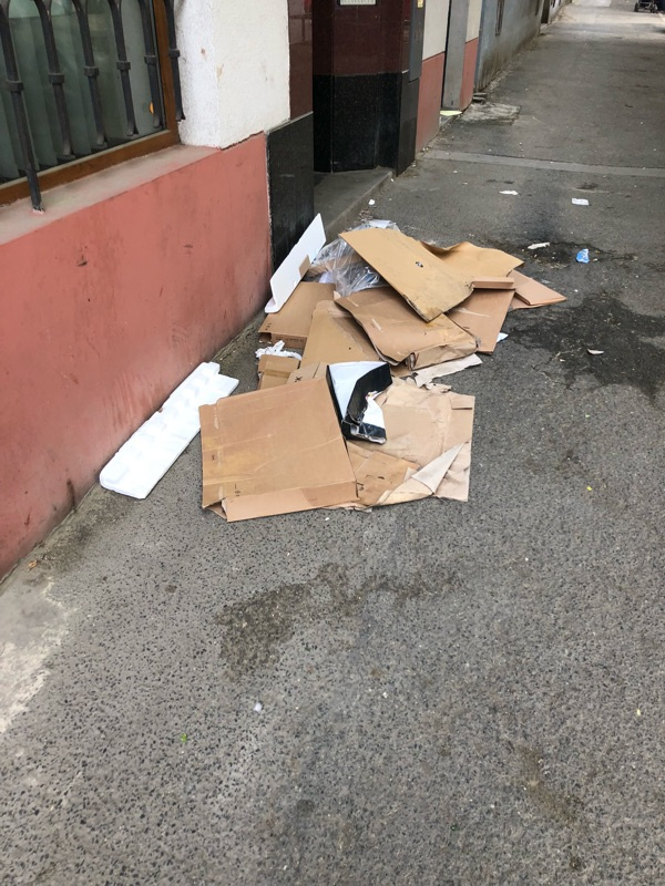 Pohozene kartony u vchodu domu, Biskupcova 37.