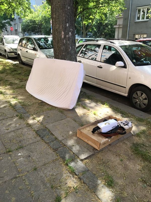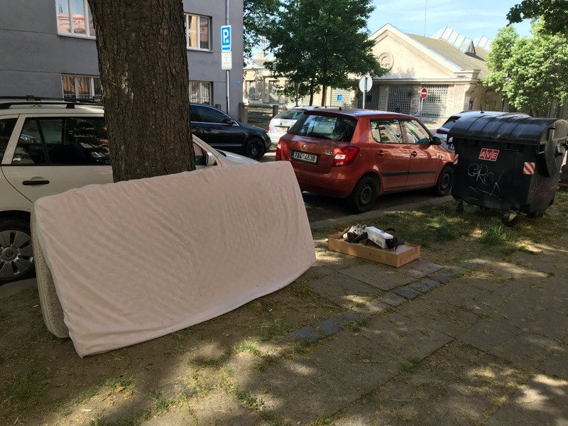 Dvě matrace, boty, krabice vyhozené u stromu na ulici