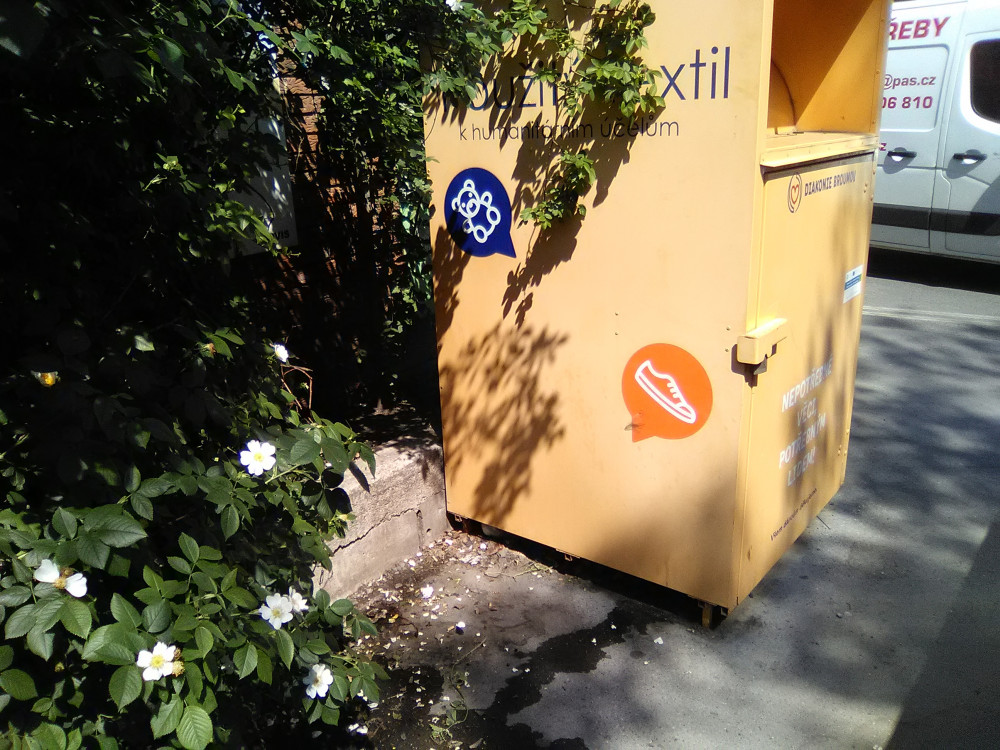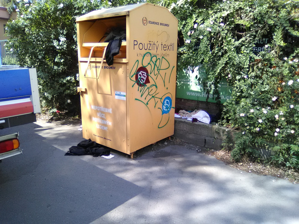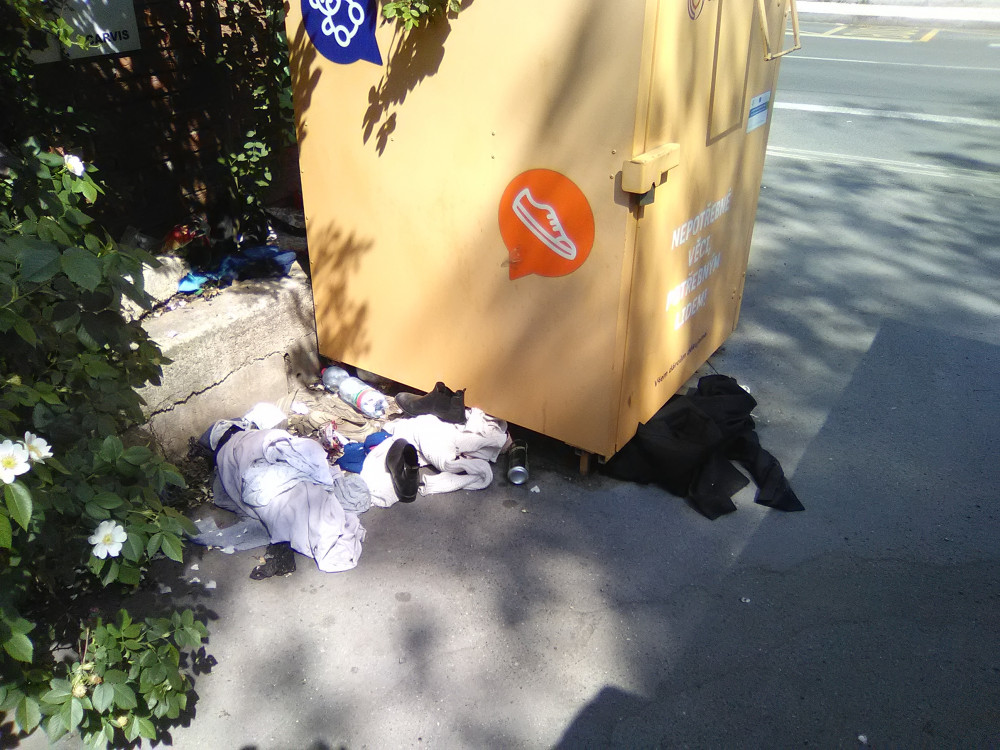 Oblečení u přeplněného kontejneru.