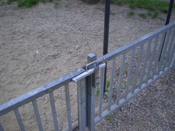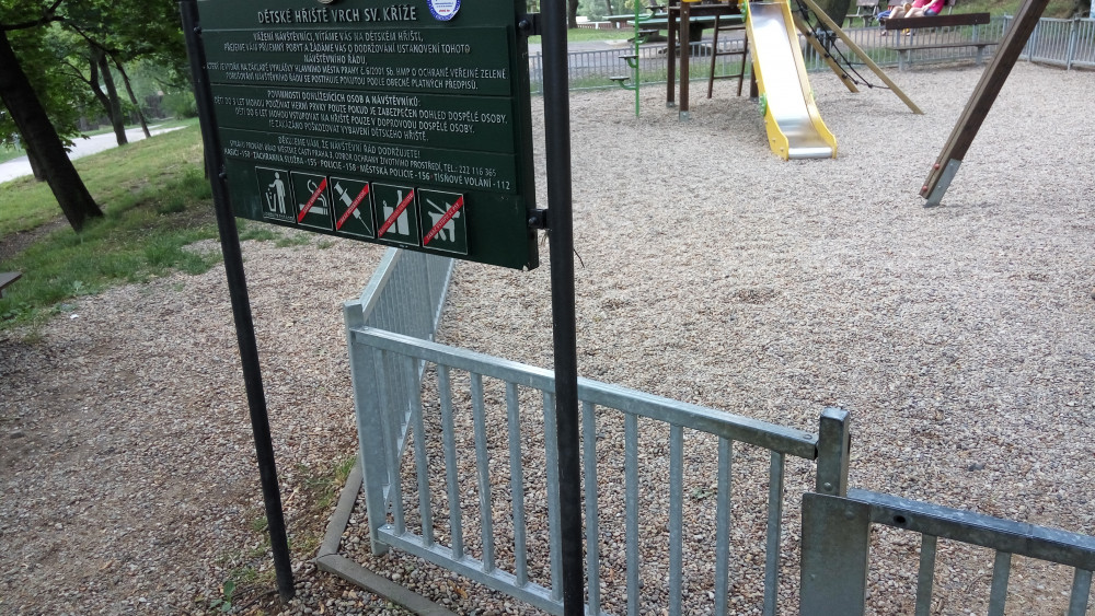 Rozbitý zámek (klika) u vchodu na dětské hřiště.